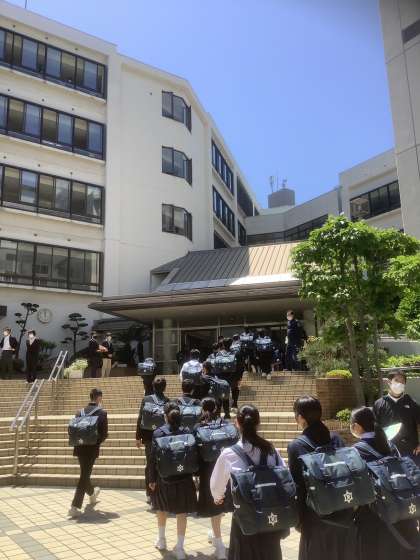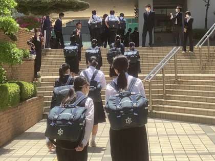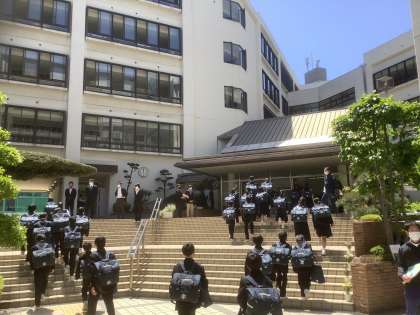 11時50分の開門と同時に登校してくる生徒たち。突き抜けるような青空のもと、多くの教職員で子どもたちを迎えています。