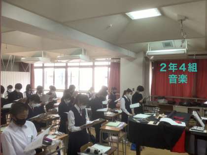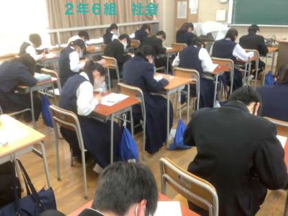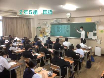 2年生の教室では、どのクラスでも、制限のある中ですが、先生方の創意工夫された授業が展開され、午前中の学びを深めたり、発展・活用したりしています。そして、生徒たちは一生懸命に集中して学習活動に挑んでいます。