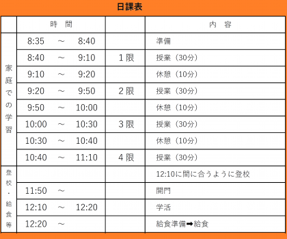 朝、きちんと定時に起床し、朝食を済ませ、オンラインやプリントでの学習に取り組みましょう。