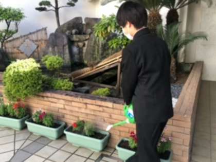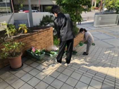 ガーデニング部が玄関と裏庭の水やり当番活動を行いました。