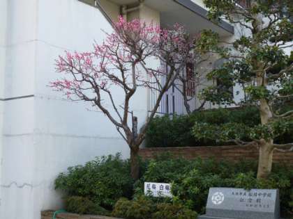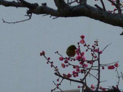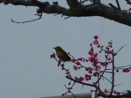 本校の正門を入って左側に「昭和63年度PTA」から寄贈された、前方が紅梅、後方に白梅が植えられています。その紅梅のこずえに「メジロ」がやってきてくれました。