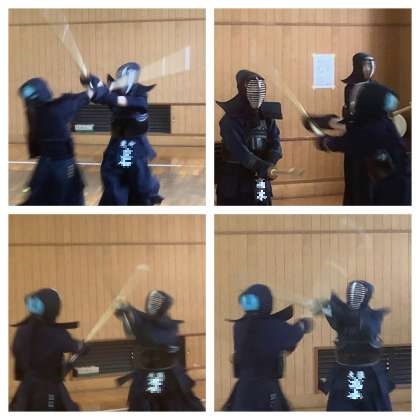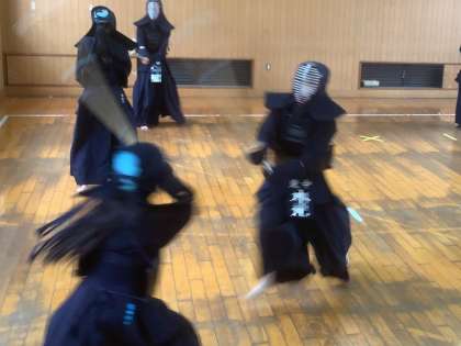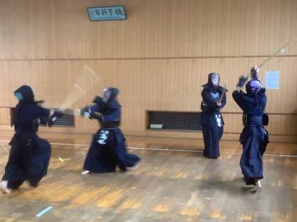 部活動指導員の先生に2分ごとに掛かり稽古。入れ替わりも素早く、先生への貴重な掛かり稽古に挑んでいます。面の下には、マスクを着用した上からマスクシールドをしての感染症対策をしています。「百折不撓」の精神で、がんばれ剣道部!