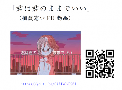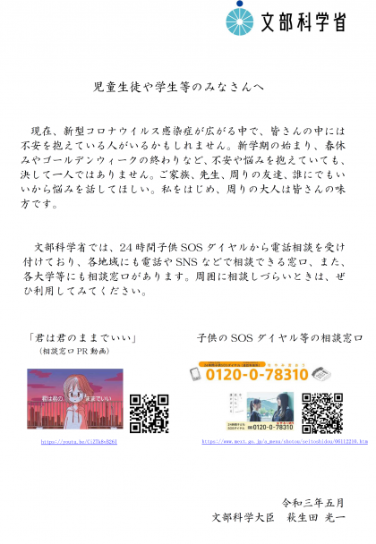 現在、新型コロナウイルス感染症が広がる中で、皆さんの中には不安を抱えている人がいるかもしれません。新学期の始まり、春休みやゴールデンウィークの終わりなど、不安や悩みを抱えていても、決して一人ではありません。ご家族、先生、周りの友達、誰にでもいいから悩みを話してほしい。私をはじめ、周りの大人は皆さんの味方です。