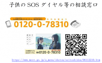文部科学省では、24 時間子供SOS ダイヤルから電話相談を受け付けており、各地域にも電話やSNS などで相談できる窓口、また、各大学等にも相談窓口があります。周囲に相談しづらいときは、ぜひ利用してみてください。