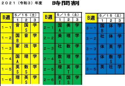 さて、明日5月15日(土)は土曜授業を行います。当日は、8時25分までに登校して、35分×3コマの授業(月5・6・学活)を行い、11時過ぎに下校の予定です。