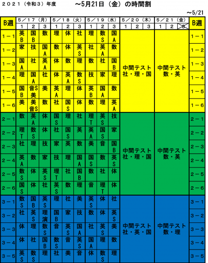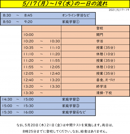 ※ 5月17日(月)〜21日(金)の予定を掲示します。担任の先生から変更の連絡があるかもしれませんので最新の情報はお子様からご確認ください。