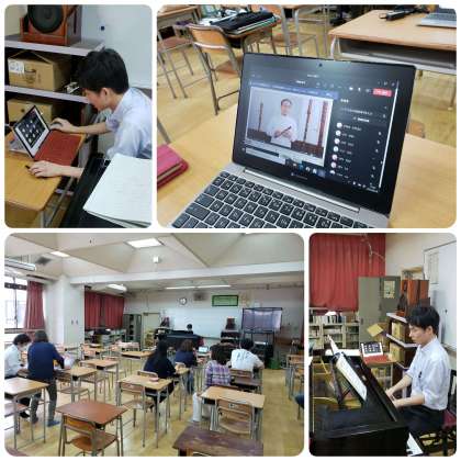 ただ今、音楽室から1年生のオンライン授業が始まりました。今日は少し繋がりにくいようですので、まだ繋がっていない人は何度かチャレンジしてみてください。