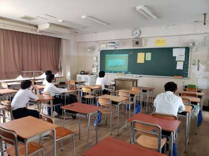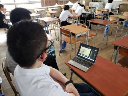 ただ今、2年生のオンライン授業が始まりました。となりの教室で先生と一緒に数名の生徒が授業を受けています。