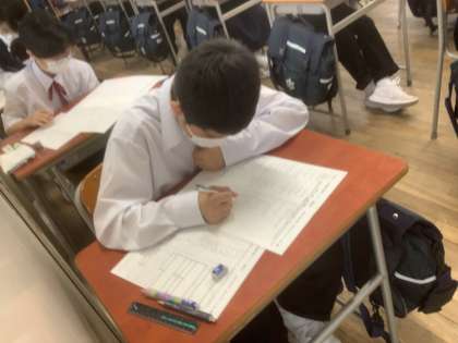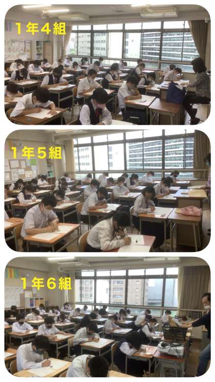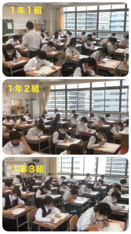 中学校へ入学して初めての定期テスト。緊急事態宣言期間を挟みましたので、試験範囲は少なめでしたが、テスト前の学習の仕方、テスト受験時のマナー、テスト返却時の学習のポイントなど、たくさんのことをこのテストを通じて学んでほしい思っています。そして、その期待に応えるように、どのクラスでも一生懸命、答案に向き合い、解答用紙に答えを書き込む姿がたくさん見られました。