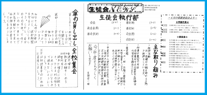 今年度、最初の生徒会ニュースが発行されました。今月号は、4月の常置委員会の報告と、「挨拶運動」「行事や集会の司会」「傘の貸し出し」などの主な取組が紹介されています。(こちらをクリックするとご覧いただけます)