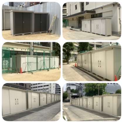 工事に合わせて、倉庫が設置されています。東側通用門からスロープに沿っての倉庫、運動場には50m走ができるように計算して設置した倉庫など、隙間の土地をうまく使い、教育活動への影響をできるだけ抑えて設置していただいています。