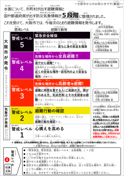 河川氾濫に伴う臨時休業等については、 気象庁等から出される 防災気象情報(警戒レベル3や4相当情報)ではなく、大阪市(大阪市長)が発令する避難情報に基づき、判断します。 以上です。