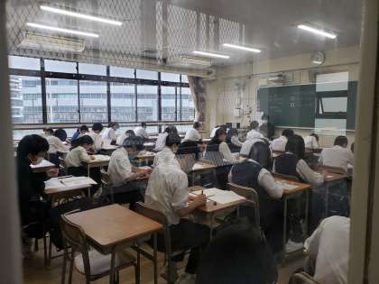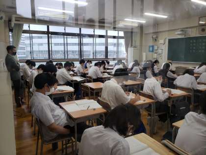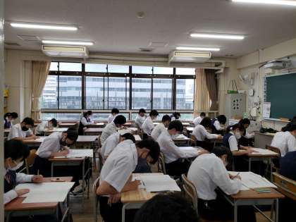 本日、3年生は全国学力学習状況調査に取り組んでいます。雨の中、真剣なモードです。