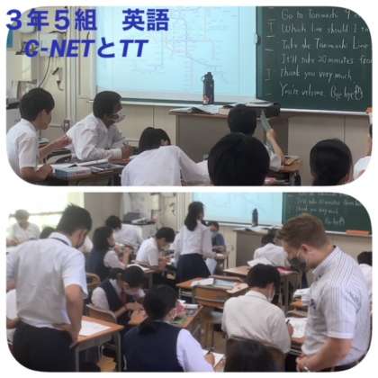5組は英語、C-NETの先生と2人の英語の先生の合計3人のTTで、大阪メトロの乗り換えに関する会話学習です。
