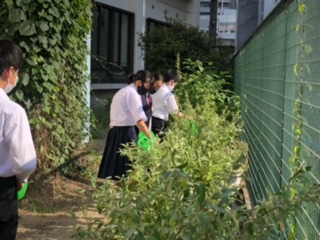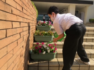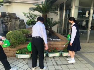 今日は1・2年生が水やりを行いました。「花がきれいに咲くように、水は土にたっぷり」と教えています。庭の裏にはアキグミの木が育っています。