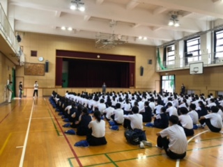 今日は、学年副主任の藤原先生から講話がありました。先週の西岡先生の「学習」のお話からバトンを受け取り、藤原先生が中学3年生の頃のお話です。