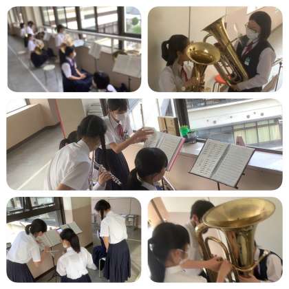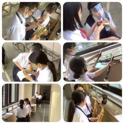 1年生が20人近く入部した吹奏楽部。1年生の楽器の分担も決まり、各パートの先輩から「3密」にならないように十分に注意して、マンツーマンで指導を受けています。2・3年生は、フェイスシールドを着け、伝える内容を整理したメモを見ながら、どのように伝えるのか言葉を選び指導しています。1年生の楽器から「音」が出た時には、当該の1年生のみならず、2・3年生にも笑顔が見られました。