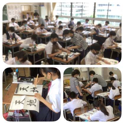 2組書写は、2人の先生によるTTです。基本的な筆遣いが確認できる「天地」を練習しています。