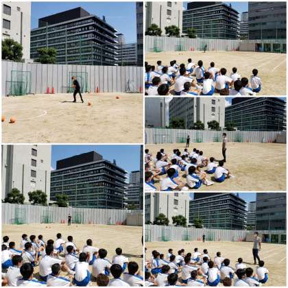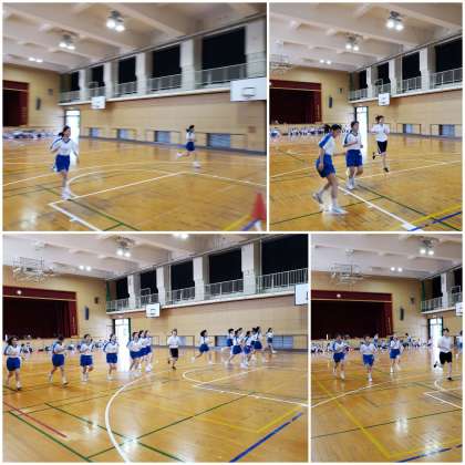 男子はハンドボール投げ、女子はシャトルランを行いました。男女とも、実習の先生が一緒に参加してくれています。