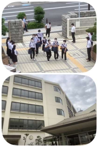 実習に来ている2人の大学院生が、正門で生徒を迎えています。