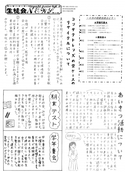 生徒会NEWS 6月号を発行しました。今月号は、表面では、「6月の常置委員会の報告」と「コンタクトレンズの空きケースのリサイクルについて」、裏面では、「あいさつ活動」「期末テスト」「学年集会」の記事を掲載しています。こちらをクリックするとご覧いただけます。