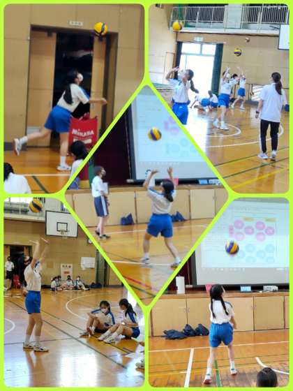 バレーボール授業では、プロジェクターに投影されたオーバーハンドパス・アンダーハンドパスの観点、班別練習隊形や実施上の注意点を確認して練習に取り組んでいます。