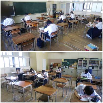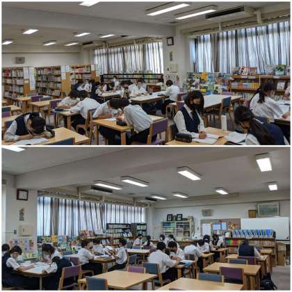 本日の元気アップ学習会もたくさんの生徒が残って頑張っています。図書室では、机の配置をかえて、1年生が静かに勉強をしています。