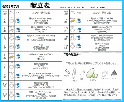 7月の給食は旬の夏野菜などがたくさん登場します。
