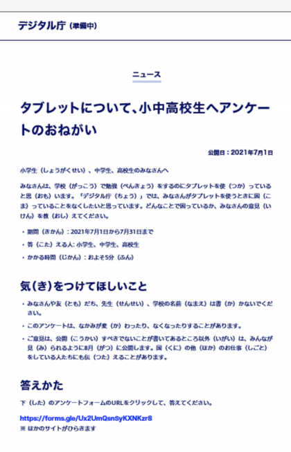 みなさんは、学校で勉強をするのにタブレットを使っていると思います。「デジタル庁」では、みなさんがタブレットを使うときに困っていることをなくしたいと思っています。どんなことで困っているか、みなさんの意見を教えてください。