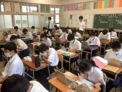 2年生の国語では、TT(ティームティーチング)で、一人1台のタブレット端末を使っての学習が行われています。Teamsの機能を使い、課題を生徒のタブレットに配信し、生徒は課題のシートに書き込んでいくというスタイルです。自宅でのオンライン学習になってもできる可能性を感じる授業です。生徒の学びの保障に向けて、先生方の授業改善が進みます。