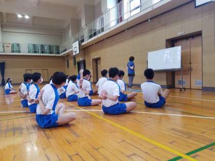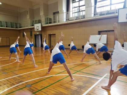体育館では、身体技法入門として、ヨガを体験しました。姿勢を正して呼吸を整えて、一つ一つの動きを丁寧に取り組みました。