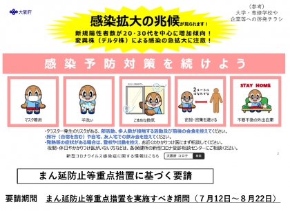 「まん延防止等重点措置」が8月22日まで延長されます。7月8日に行われた大阪府の会議の資料でも感染者数の増加が危惧されている資料がありました。一人ひとりが感染症対策をとり、ルールを守り、部活動ができる環境を守ります。
