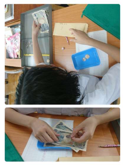 今日は、実際に硬貨・紙幣をさわりました。作業後は、石鹸で手洗い・手指消毒しました。