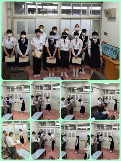 本日、校長室において、令和3年度「第71回 社会を明るくする運動」表彰式が行われています。中央区長さま・保護司会代表者さま、中央区役所の皆さまにご来校いただきました。本校からは「作文入選者3名」、「絵・ポスター入選者5名」の合計8名の生徒の皆さんが受賞しました。おめでとうございます。
