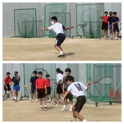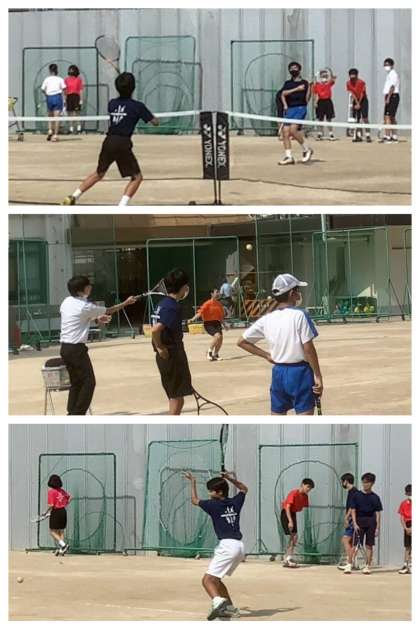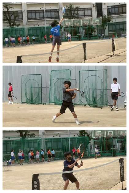 懇談4日目。午後の運動場では、夏の陽射しをいっぱいに浴びて、ソフトテニス部が活動しています。