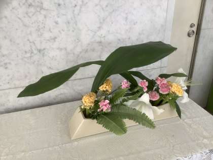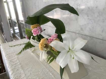 白色の大きな「ユリ」に淡い色の「ケイトウ(鶏頭)」と「カーネーション」、深い緑色の「ハラン」と「おしだ」のバランスが絶妙です。花々が梅雨特有の蒸し暑さを癒してくれます。
