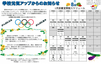 夏休みには午前中(10時〜11時50分)11日間 自主学習の場として図書室の開館を予定しています。課題に取り組む人・自主学習をする人はぜひ利用してください(室内を涼しくしています)。