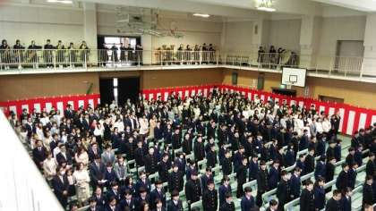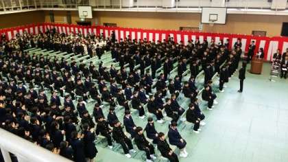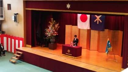 入学式。入場、胸をはって堂々と。初めて聞く校歌、校長先生のお話「校歌には、本校の教育目標である、≪心優しく生きよう≫ ≪自ら学ぼう≫ ≪体を鍛えよう≫ということばが盛り込まれています。」