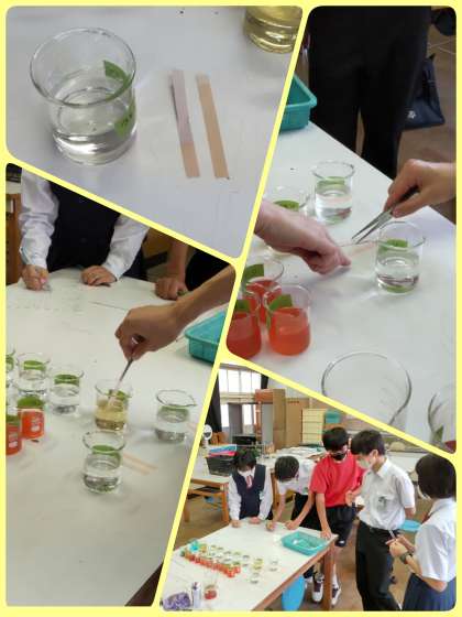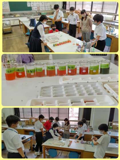 本日は、紫の野菜ジュースを使い、酸性とアルカリ性について調べました。