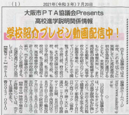 毎月20日に発行されている大阪市PTAだより。7月号では、大阪市PTA協議会Presents 高校進学説明会関係情報として、高等学校から提供されたプレゼン動画を集め、一元化された「学校紹介プレゼン動画配信中!」の記事が掲載されています。