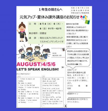 こちらをクリックすると1年生英語課外講座のお知らせがご覧いただけます