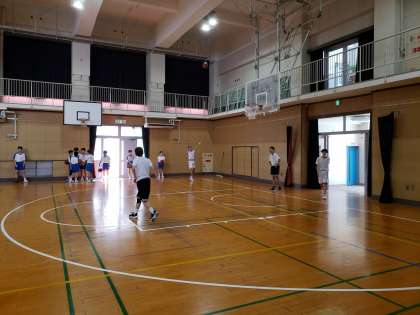 シュート練習。1年生もドリブルのつきかたなど基本練習から始めています。
