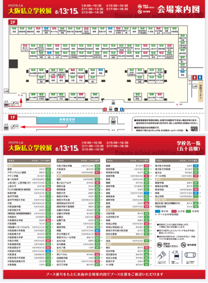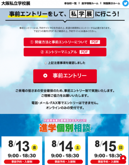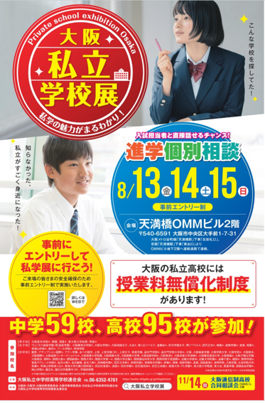 大阪私立学校展が、8月13日(金)から15日(日)に、天満橋OMMビル2Fで開催されます。今年は、感染症対策のため事前予約・入替制(90分)で、事前エントリーされた方のみ入場でき、個別進学相談のみの実施です。
