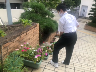 よく晴れた朝でした。玄関の花は、気づいたときに部員で花柄摘みをしているので、何度も何度も綺麗に咲きます。「もう最後かな?」と思いながらも、諦めずお世話をすることで、また復活を見ることができます。今日は3人の部員が集まって、24個のトマトを収穫できました。