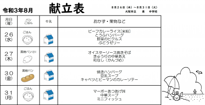 8月と9月の給食献立のイラストメニューを再掲します。なお、明日27日(金)は午前中のみの授業と予定していましたが、6時限まで授業をすることに変更していますのでご注意ください。