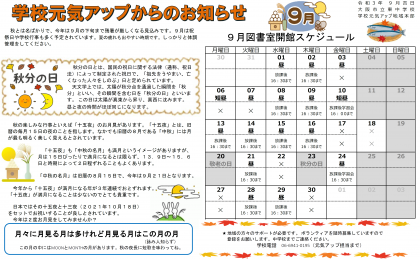 秋とは名ばかりで、今年は9月の下旬まで残暑が厳しくなる見込みです。9月は、祝祭日や学校行事も多く予定されています。夏の疲れも出やすい時期です。しっかりと体調管理をしてください。