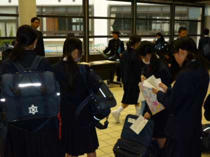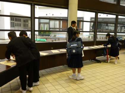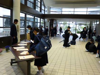 登校してきた1年生は、楽しみにしていた部活動の仮入部カードを受け付けに提出しています。13、16、17、20日の4日間で、興味や関心のある部活動に仮入部し、最終的に、自分が3年間頑張っていける部活動を決めます。