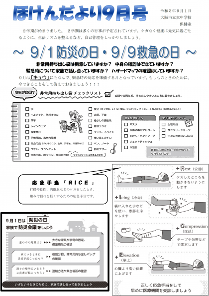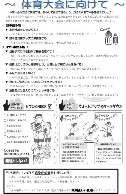 表面では、「防災の日」「救急の日」などの記事を、裏面には「体育大会に向けて」の記事を掲載しています。
