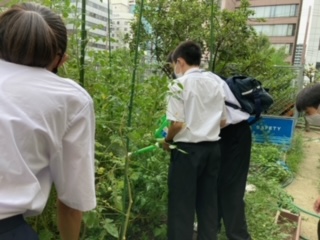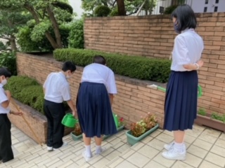 今週は暑い日が続き、午前中に水まきをする日もありました。今日は、放課後に1年生が集まって水をまきました。