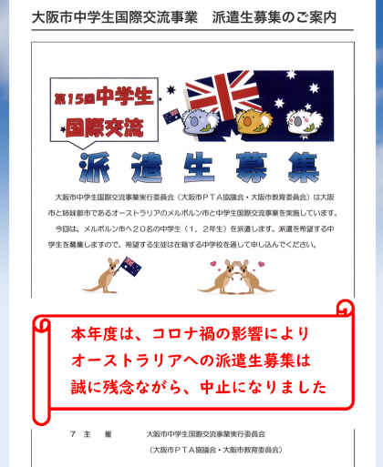 大阪市PTA協議会からのお知らせ「令和3年度 大阪市中学生国際交流事業(オーストラリア派遣)再延期のお知らせ」